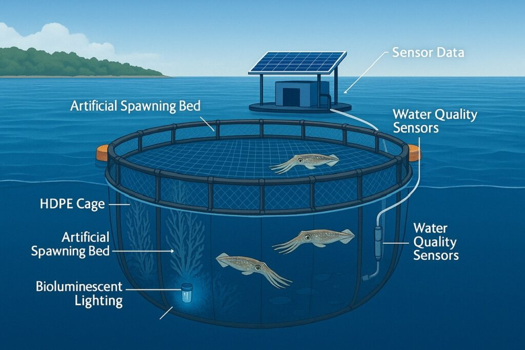 Đặc biệt, khi kết hợp nuôi biển tuần hoàn (RAS – Recirculating Aquaculture System) hoặc nuôi trên cạn với công nghệ điều khiển môi trường, sản xuất mực có thể được triển khai ở những khu vực xa biển hoặc đất cằn khô hạn, mở ra tiềm năng sản xuất lương thực thủy sản tại các vùng không truyền thống. Mực nuôi khép kín cũng gần như không nhiễm ký sinh trùng anisakis, giúp việc quản lý an toàn thực phẩm dễ dàng hơn.